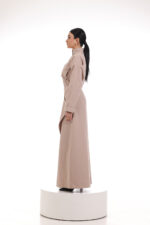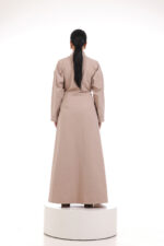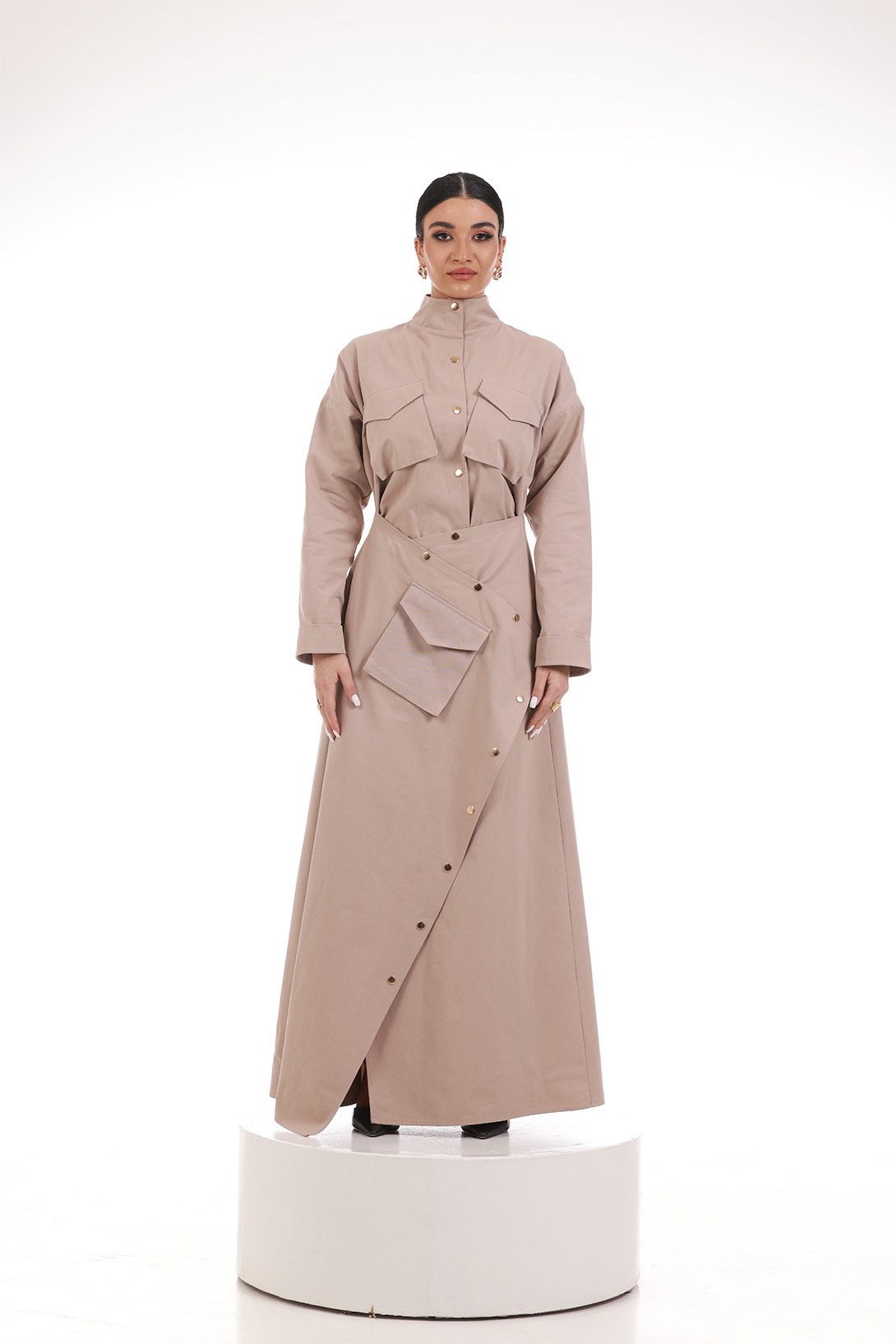 A structured maxi dress defined by a high collar, functional utility pockets, and an asymmetric wrap skirt, finished with gold snap-button detailing.