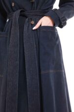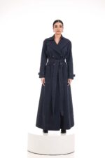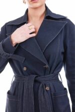 A structured longline denim coat with a belted waist and refined stitching, designed for quiet strength and timeless elegance.