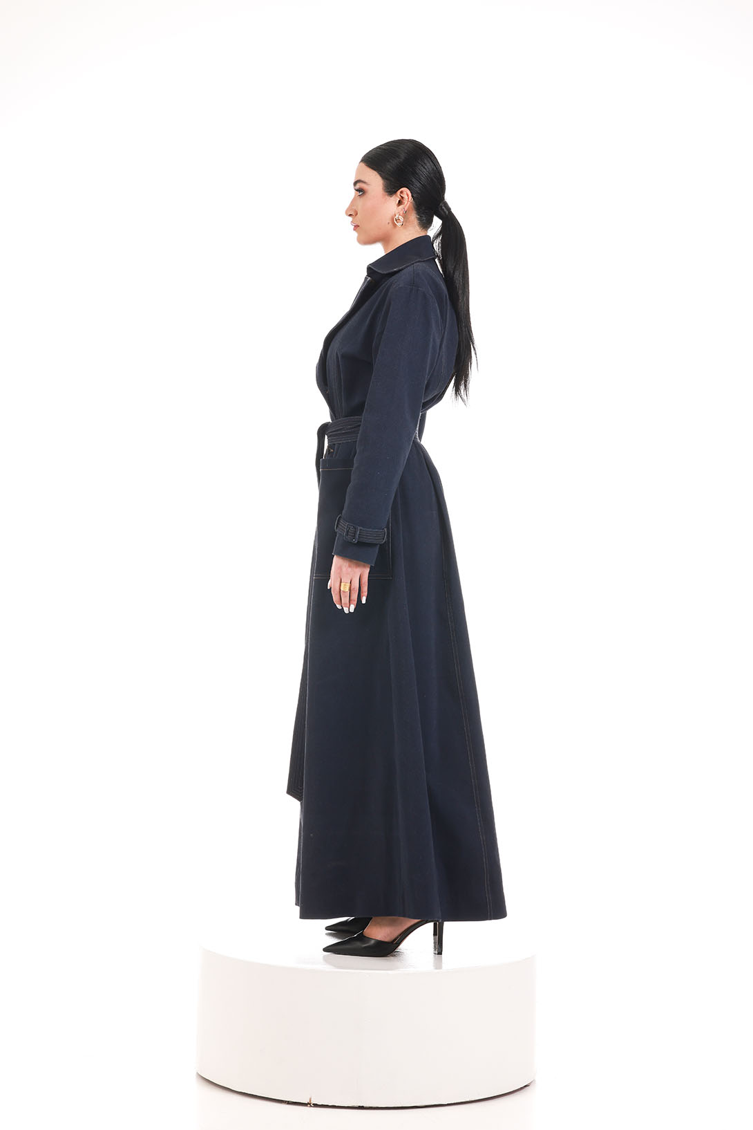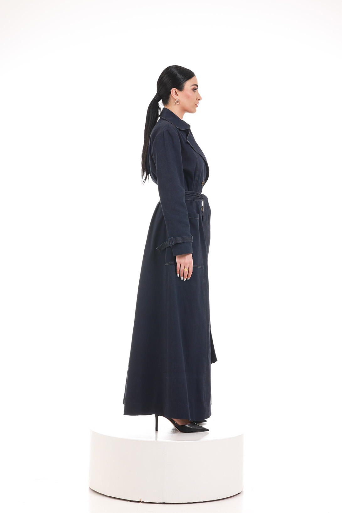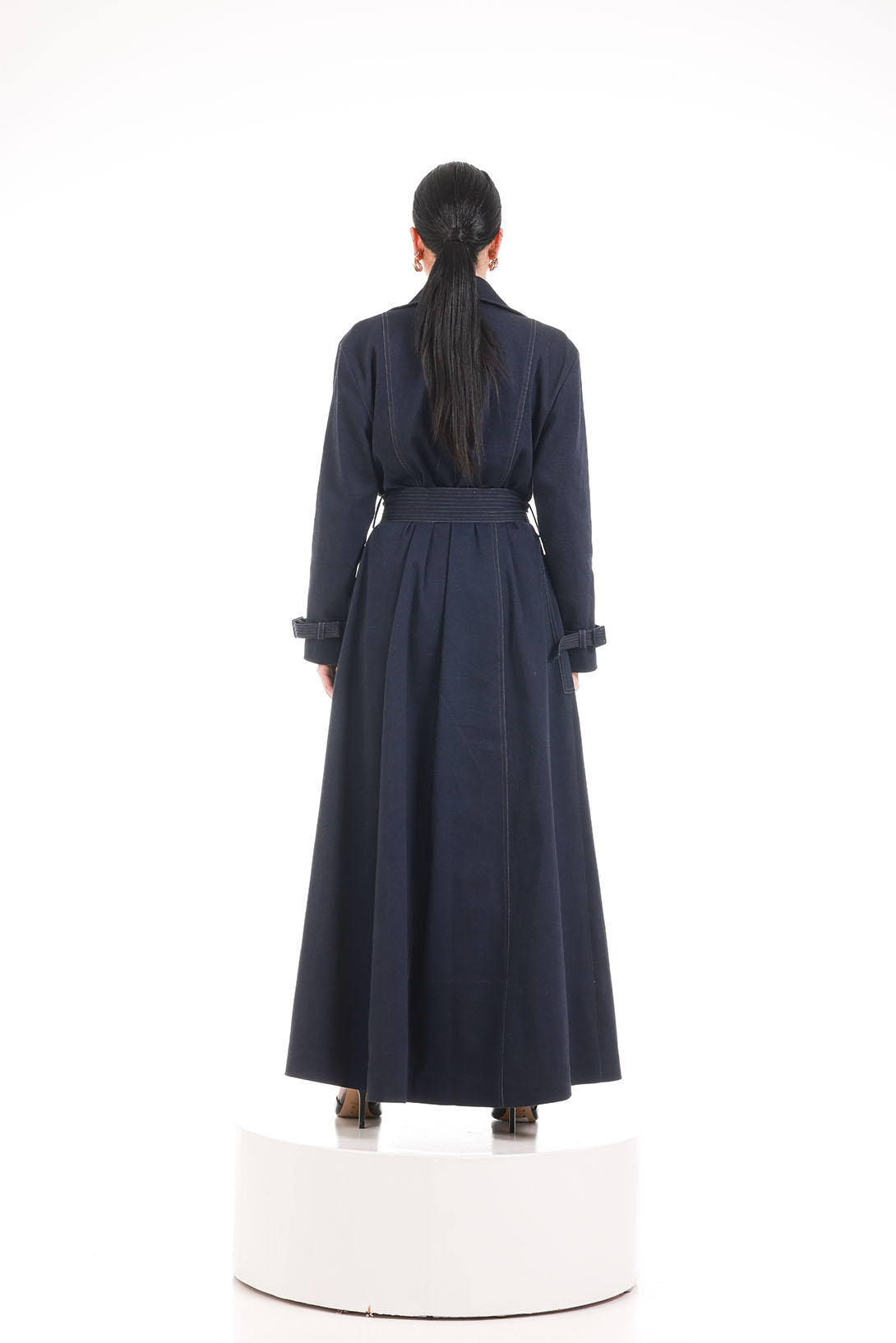 A structured longline denim coat with a belted waist and refined stitching, designed for quiet strength and timeless elegance.